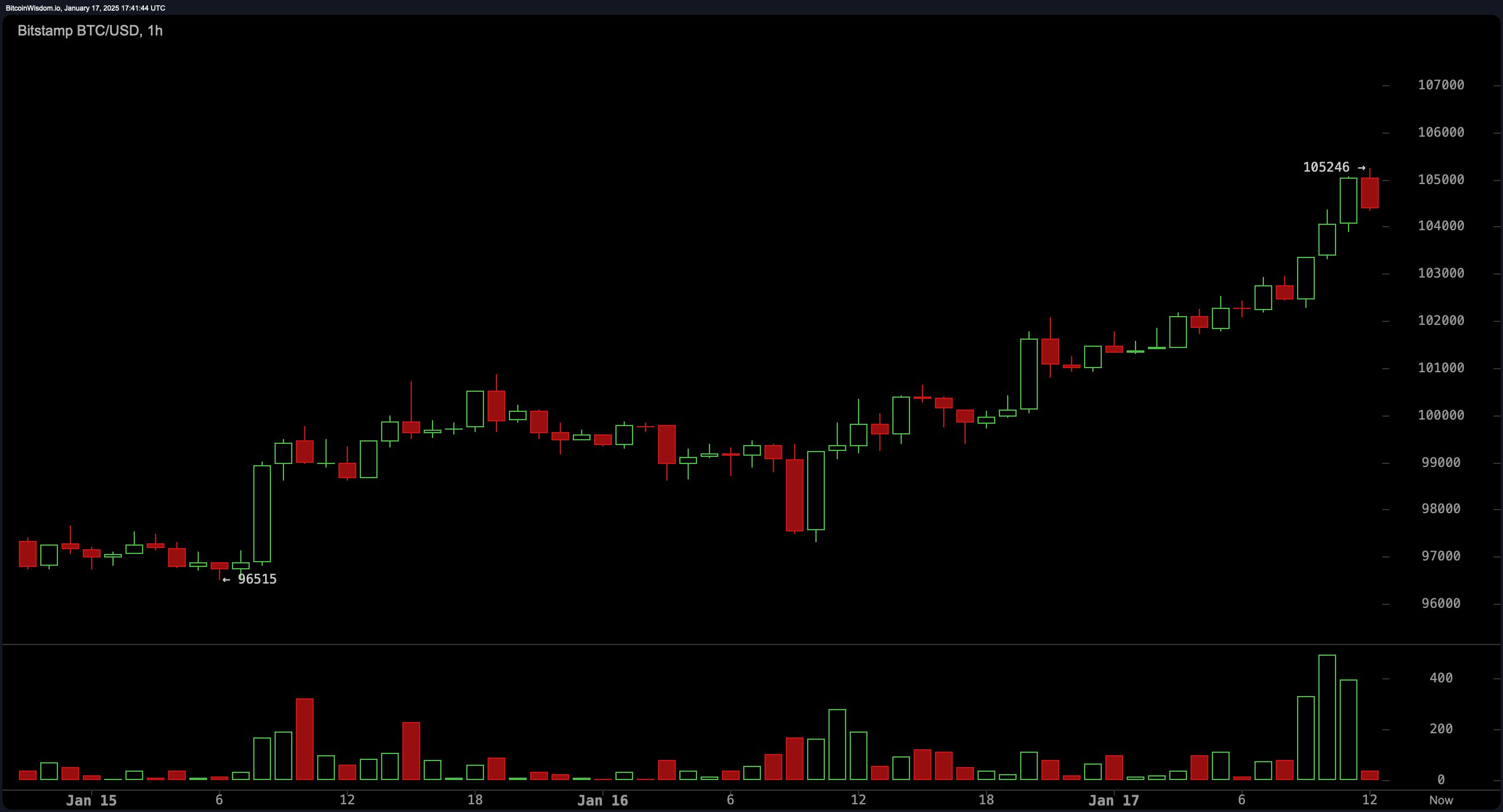 BTC/USD on Jan. 17, 2025. The price tapped an intraday high of $105,246 per coin.