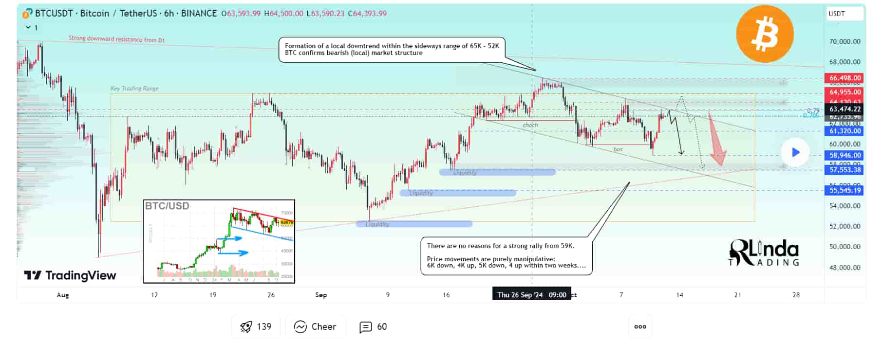 RLinda observed that the price failed to break through the critical resistance zone near $65,000, leading to an 11% drop back to $59,000.