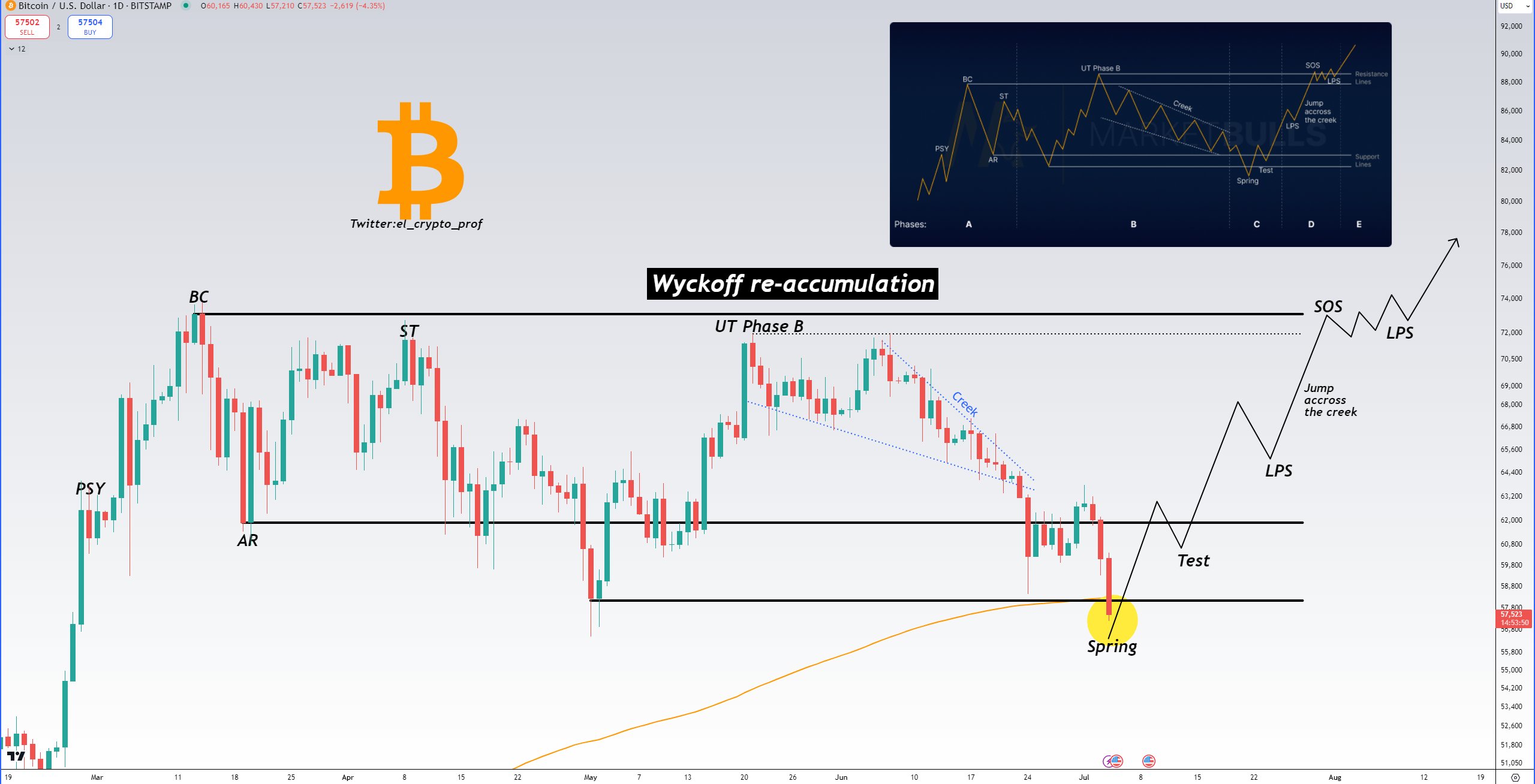 As it is, Bitcoin is retesting the primary support, with the July 4 bar piercing $60,000 and dropping to as low as $56,900 earlier today. Based on the Wyckoff model, prices are priming for the spring phase. This preview will hold, especially if there is no confirmation of today’s losses.