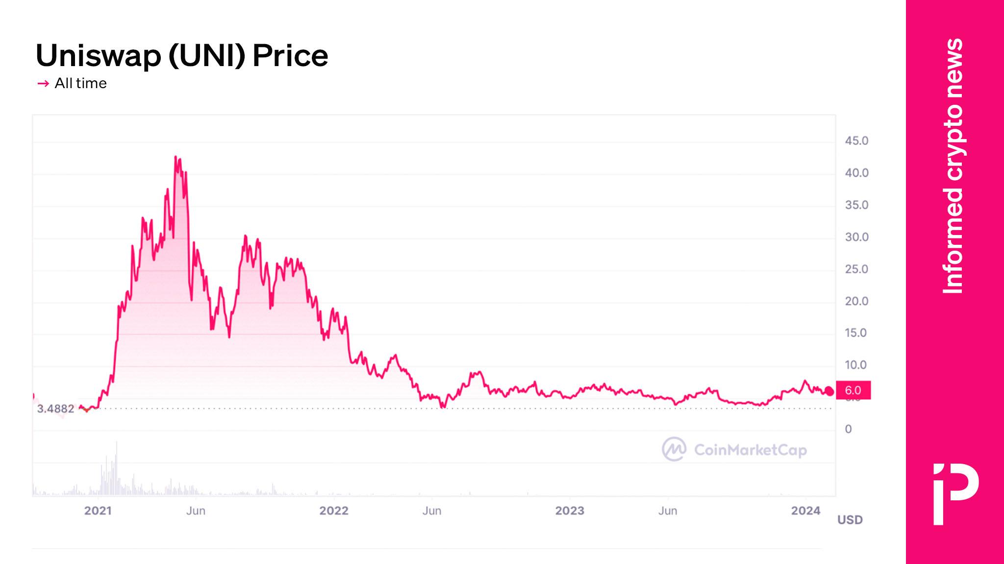 Some UNI tokenholders have had enough. The DeFi Education Fund, which holds approximately $3 million worth of UNI, announced its intention to sell the rest of its position. More generally, investors are underwhelmed with UNI. The token has not made a new high in three years and still languishes 85% below its $44.92 all-time high.