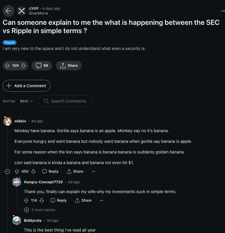 In a Reddit discussion sparked by a user’s request for a simple explanation of the Ripple vs. SEC case, another user provided a creative and illustrative metaphor: