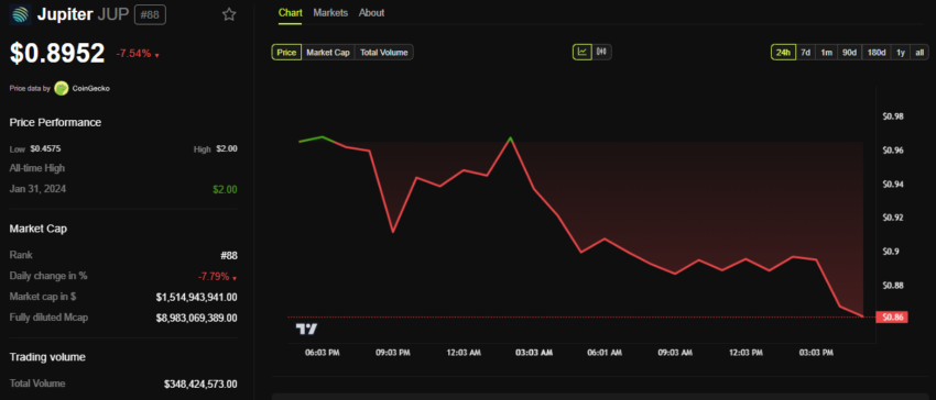 Despite news about the Jupiter airdrop claim, the JUP token saw a 7.5% price decrease in the last 24 hours, trading at $0.89 as of this writing.