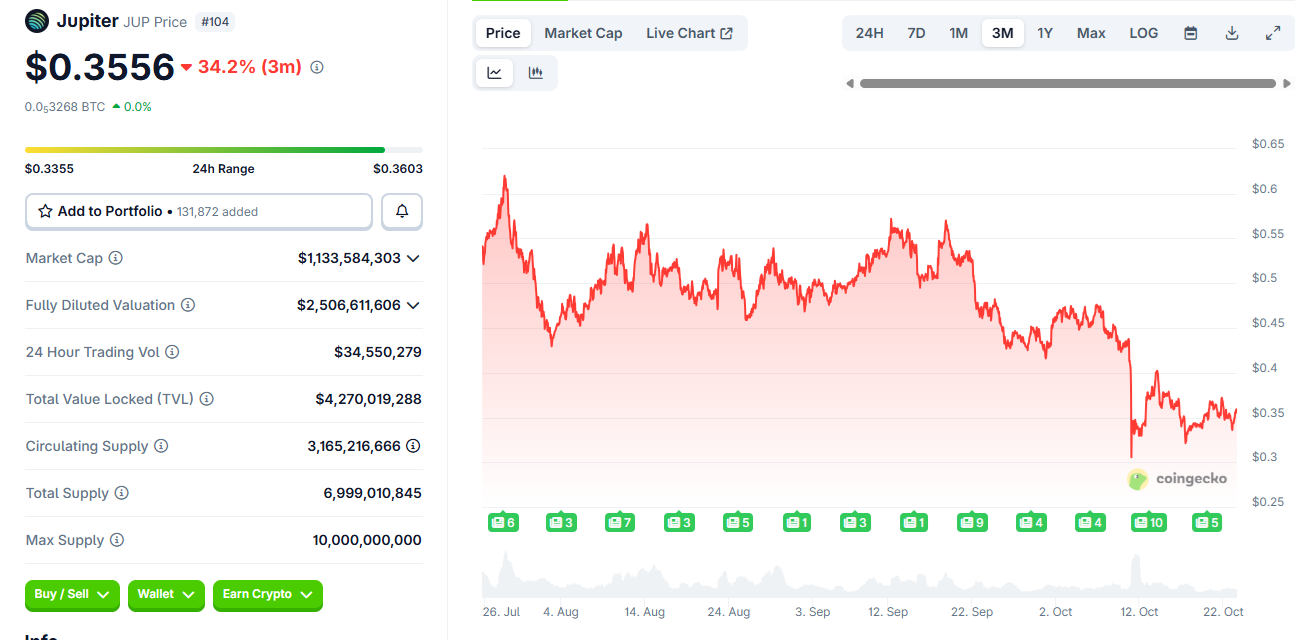 As of October 23, JUP traded at around $0.35, near a three-month low. Based on the current market moves, JUP is considered potentially undervalued, compared to Jupiter’s activity and demand.