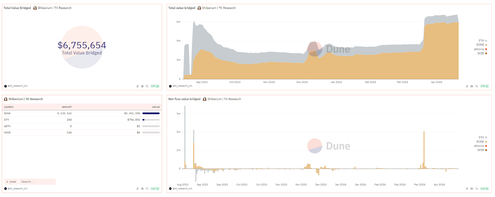 According to TX Research, almost all assets within Shibarium consist of the BONE token, with just 250 ETH following.