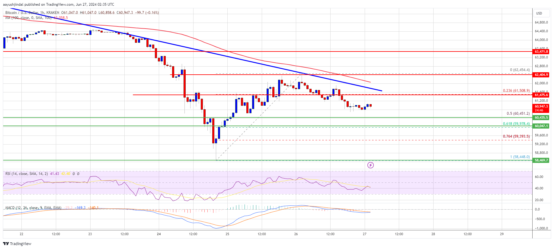 A high was formed at $62,454 and the price is now moving lower. There was a move below the $61,500 level. The price declined below the 23.6% Fib retracement level of the upward move from the $58,448 swing low to the $62,454 high.