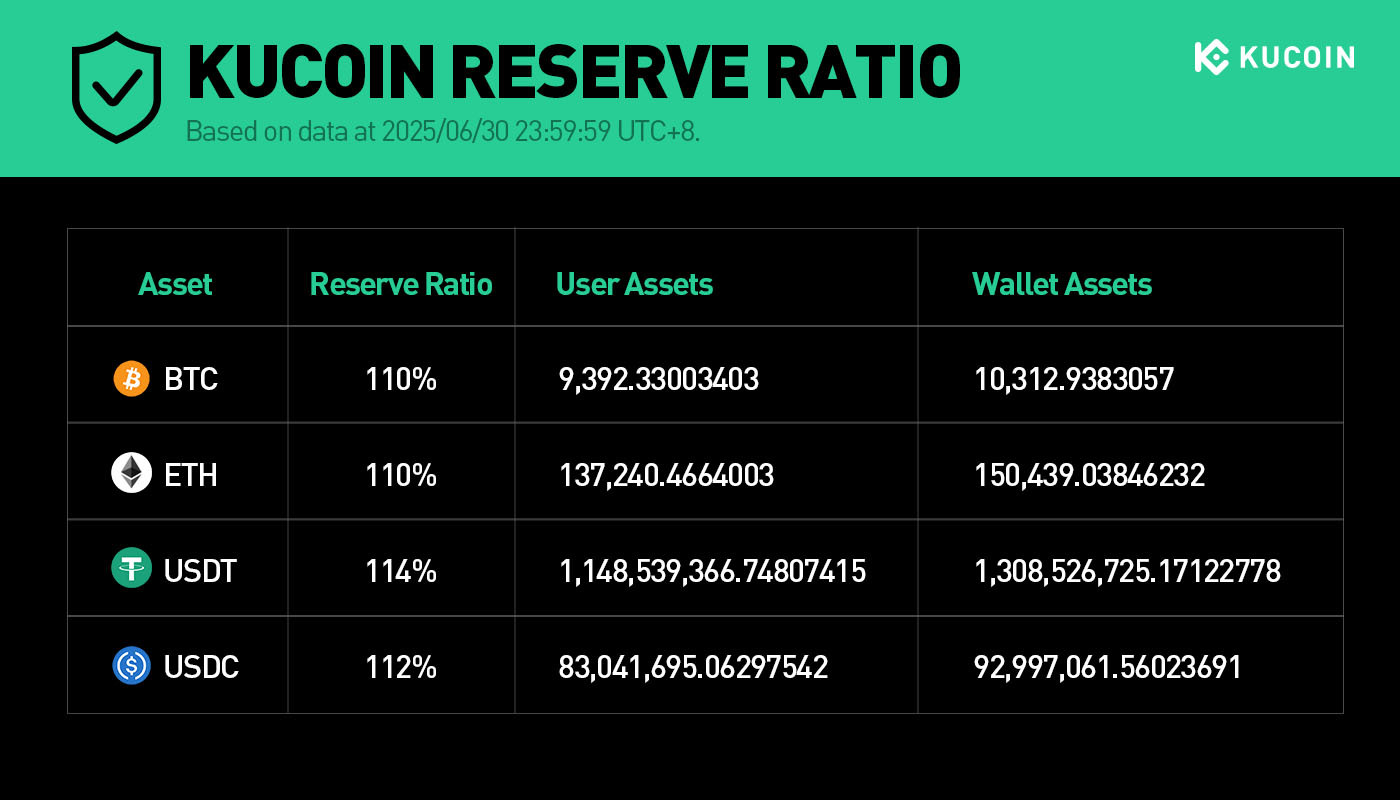 In the latest audit, KuCoin demonstrated that it holds more than enough crypto assets to cover all user liabilities across supported tokens. The reserve ratios for key cryptocurrencies as of June 30, 2025, are: