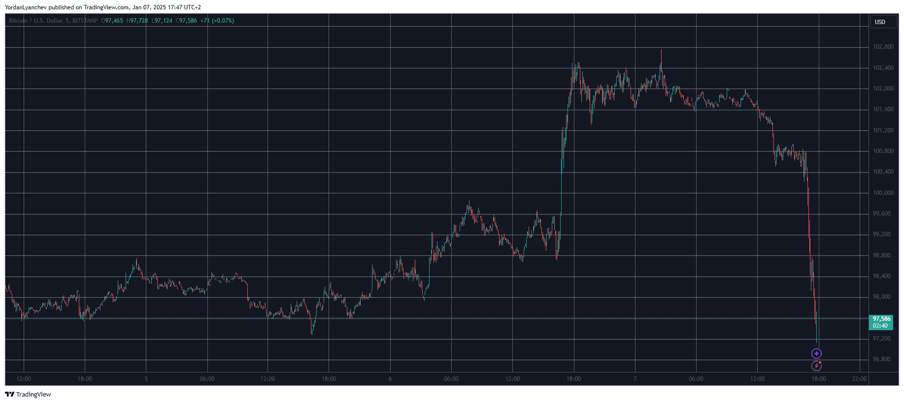 However, it failed to continue its run and started to lose value gradually. It settled at around $102,000 later that day before the bears took control of the market an hour ago. Since then, the primary cryptocurrency has lost almost $5,000 and dumped to $97,160 (on Bitstamp).