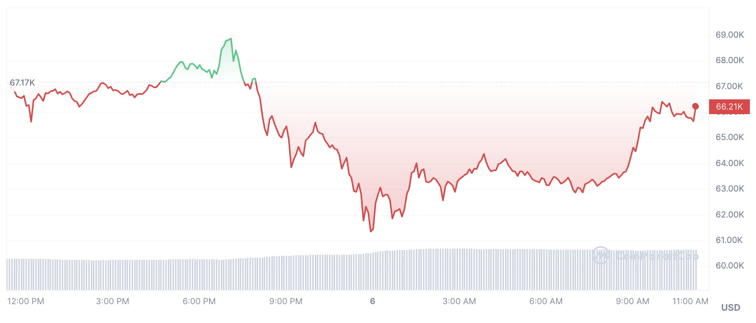 Despite the initial setback, Bitcoin has shown resilience, staging a partial recovery. As of now, the cryptocurrency has rebounded to $66,200, reclaiming over 60% of the earlier losses. This upward momentum suggests a positive trend, albeit amid lingering uncertainty.