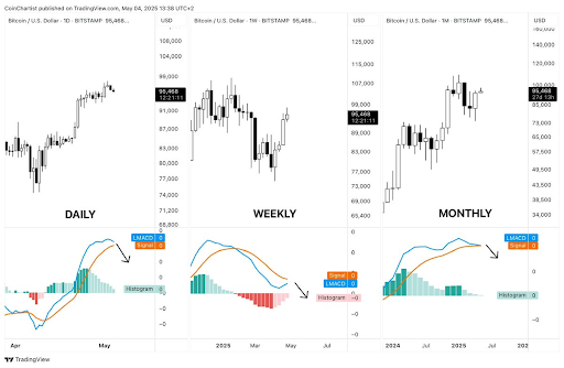 In an X post, Tony Severino stated that multiple BTC timeframe analyses using the LMACD indicator suggest that the Bitcoin price is in a precarious position. He remarked that if the daily momentum crosses bearish, it could prevent the weekly bullish crossover and pull the weekly LMACD below zero. This would cross the monthly LMACD back bearish.