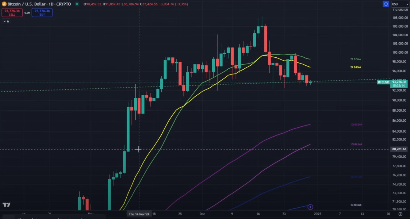 “If we essentially are treating the 21-day [EMA] resistance, we’re looking for our next major moving average pairing as potential support. And the earliest that we’re going to probably reach there is probably the 100-day [EMA] which is down here at around $85,000…