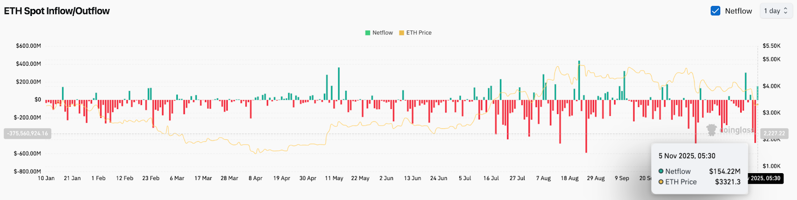 Spot flow data from Coinglass reveals why the decline accelerated. On November 5, Ethereum recorded $154.2 million in net outflows, signaling active distribution as tokens moved from wallets to exchanges. Outflows of this size typically indicate profit taking or preparation for selling, not accumulation.