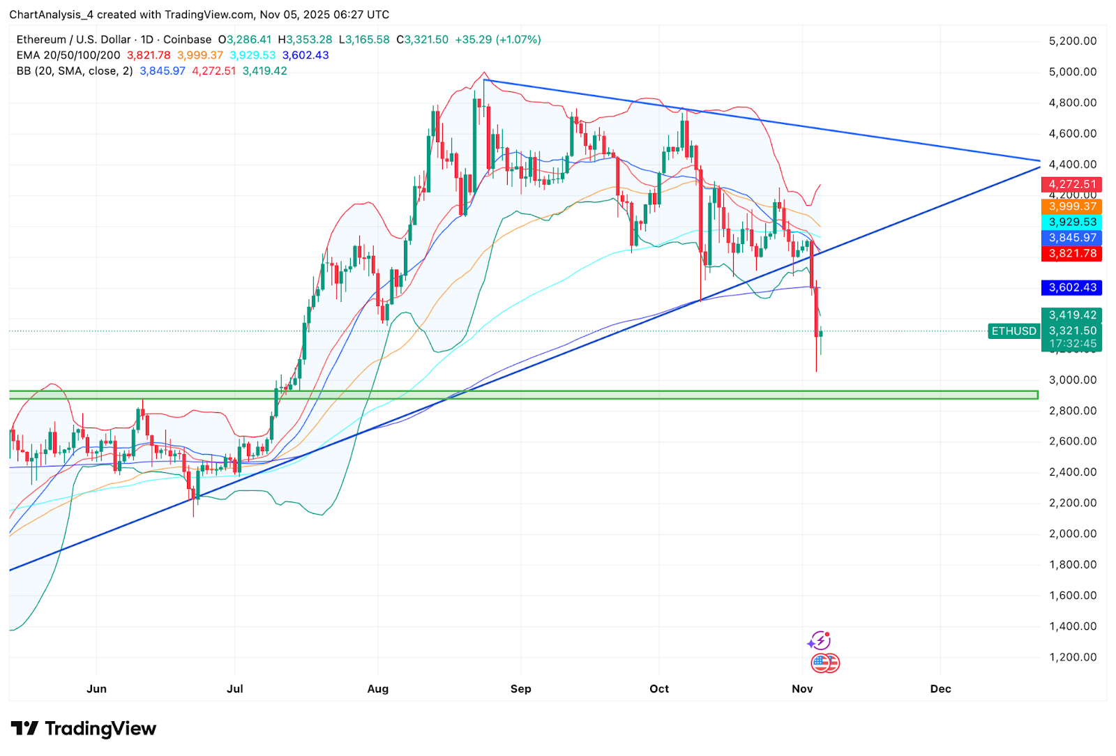 Ethereum price today trades near $3,325 after losing its multi month trendline and slipping below the 20, 50 and 100 day moving averages. The breakdown shifted momentum to sellers and opened the door toward the high liquidity zone around $3,000 to $2,800, an area highlighted by market structure, historical demand, and recent liquidity heatmaps.