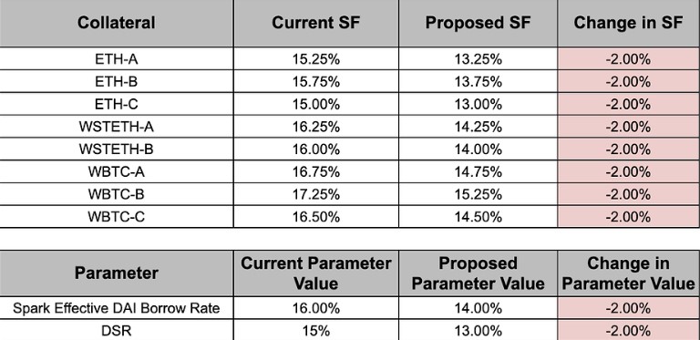 As shown in the table above, the proposed changes include reducing the Stability Fee by 2 percentage points for various collateral types such as ETH-A, ETH-B, ETH-C, WSTETH-A, WSTETH-B, WBTC-A, WBTC-B, WBTC-C. In addition, the Dai Savings Rate (DSR) and the Effective DAI Borrowing Rate for Spark will also be reduced by 2 percentage points.