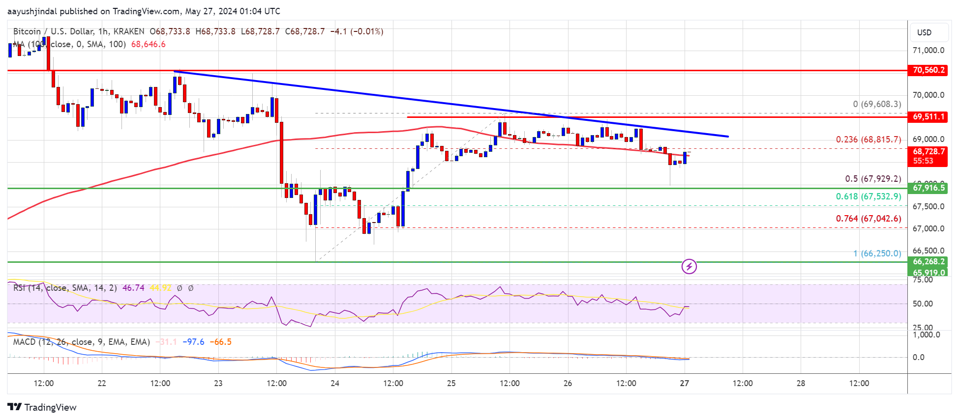 A high was formed near $69,608 and the price is now correcting gains. There was a move below the 23.6% Fib retracement level of the upward move from the $66,250 swing low to the $69,608 high. It even tested the $68,000 support zone.