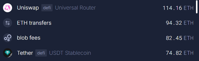 As a result of increased competition, blobs became the third-largest fee burner on Ethereum. Payments for blobs surpassed even the Tether smart contract, and moved closer to fees for all ETH transfers on the network.
