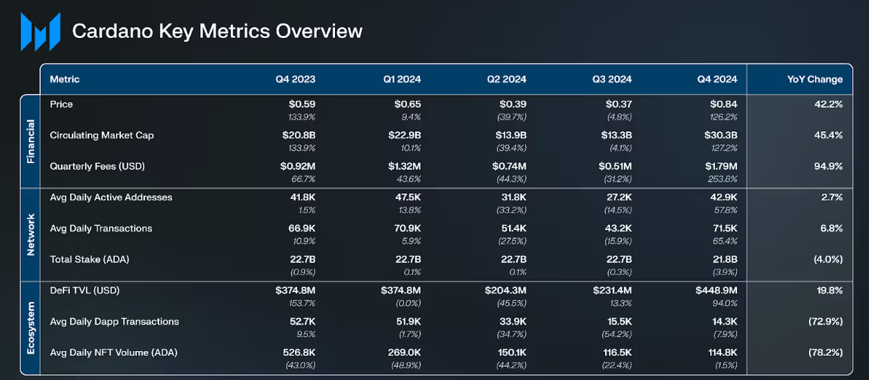 Meanwhile, the total value of decentralized finance (DeFi) locked in on the Cardano network saw a considerable upside last year. After a 94% boost in Q4 to $448.9 million, the ecosystem recorded an uptick year-over-year, outdoing its 2023 value by 19.8%.