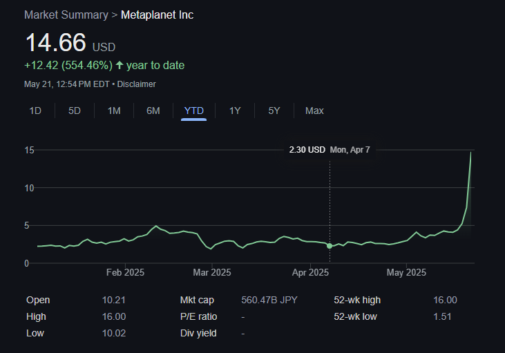 In just over a year, Metaplanet has expanded its holdings from 98 BTC to 7,800 BTC (as of May 19, 2025), acquired at an average price of $103,873 per coin. That stash is now worth over $800 million, as Bitcoin’s record-breaking run this year.