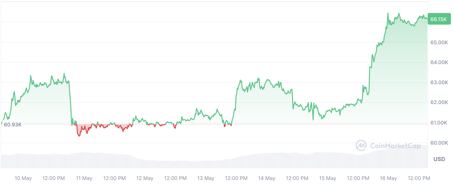 As Saylor continues to provide insights into Bitcoin’s significance, the cryptocurrency itself experiences a positive trajectory. Currently trading at $66,000 following a notable 7.5% increase, BTC remains near its recent highs, with a slight dip of around 12%.