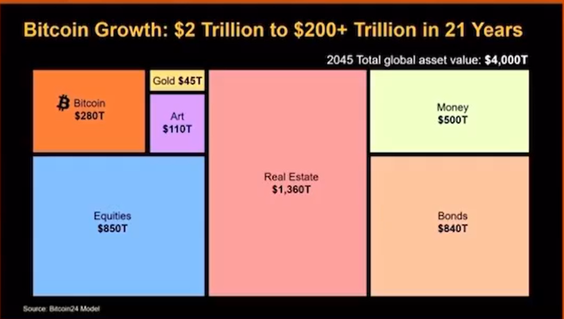 Currently at $96,627, Bitcoin’s market cap stands at $1.92 trillion. At $280 trillion, the premier asset’s valuation would have grown a staggering 14,483%.