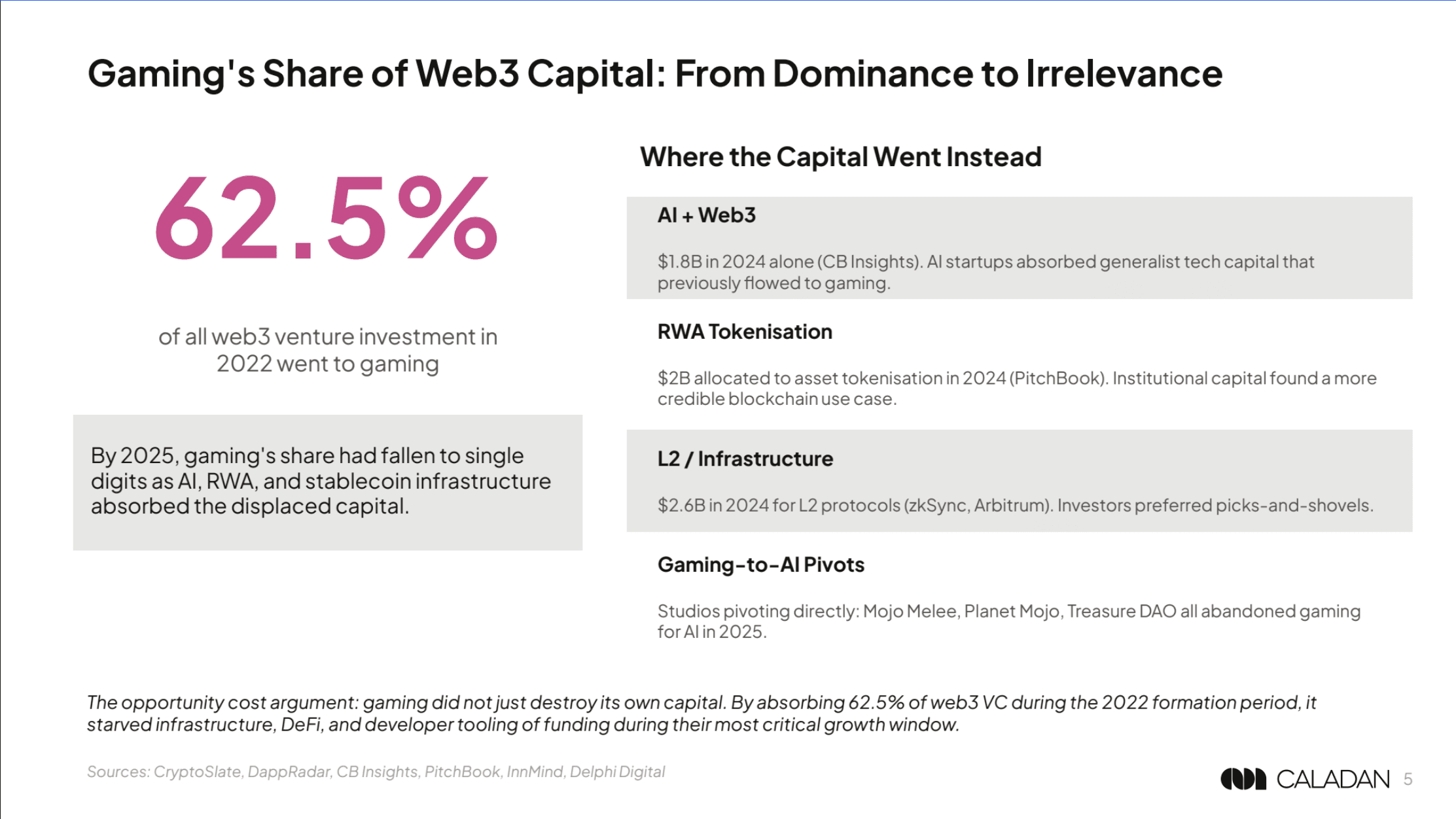 The most telling data point may be where the money went instead. Gaming commanded 62.5% of all Web3 venture investment in 2022; by 2025, its share had collapsed to single digits as AI, real-world-asset tokenization and layer-2 infrastructure absorbed the displaced capital.