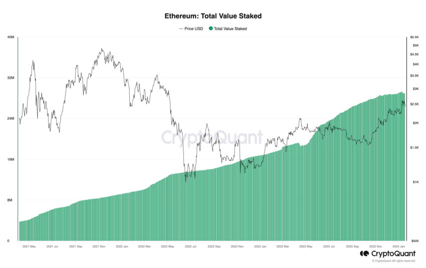 Ethereum (ETH) has reached a significant milestone, with 24% of its total supply now staked. This development reflects a growing tendency among ETH holders to prioritize earning passive income through staking rather than selling their assets for immediate price appreciation.