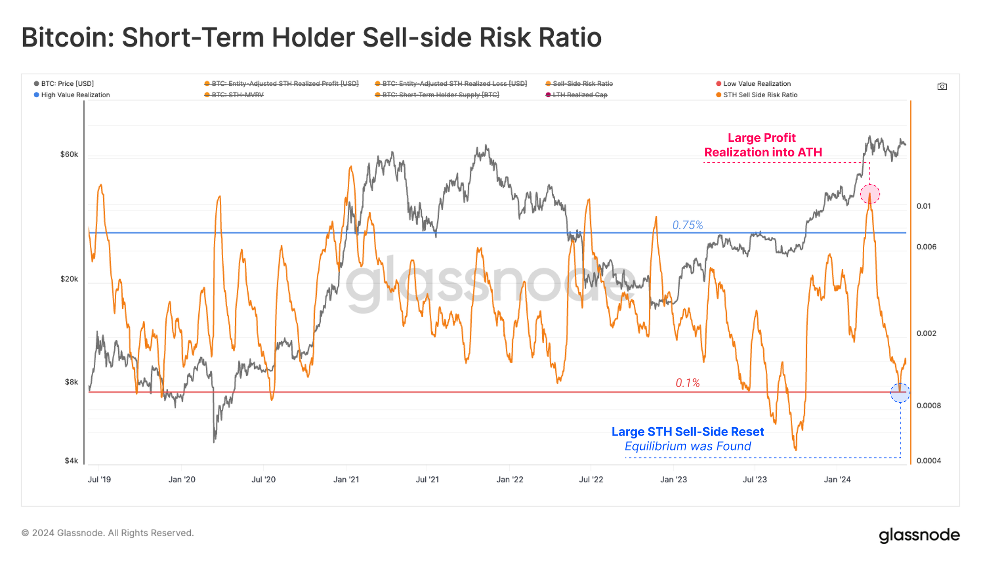 The sell-side risk ratio takes the sum of all profits and losses realized on-chain and divides that by the realized cap, which represents the value of each Bitcoin when it last moved rather than its current market value.