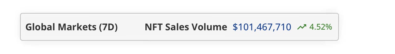 Despite a general decline in cryptocurrency markets this week, non-fungible token (NFT) sales rose by 4.52% compared to the previous week. NFT sales totaled approximately $101,467,710 over the past seven days, with Ethereum-based digital collectibles dominating the market.