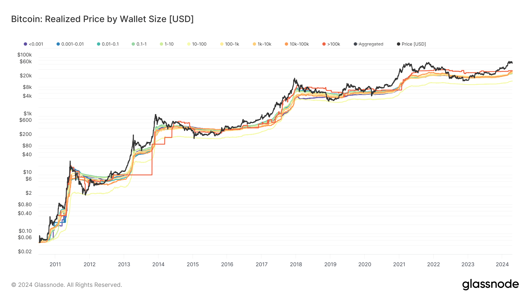 The realized price above chart shows the average cost at which Bitcoin holders have acquired their coins, broken down by the size of their wallets since 2010. The “Realized Price” measures the average price paid for Bitcoin based on when each coin was last moved. This doesn’t necessarily match the current market price but rather reflects the average acquisition cost over time.
