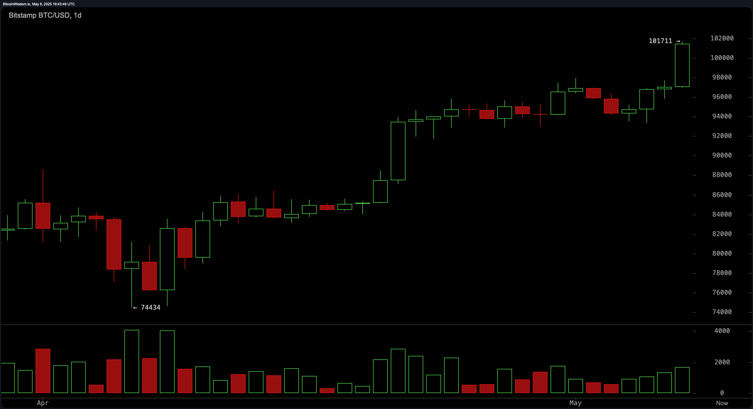 Bitcoin’s price is coasting along at $101,251 on May 8, 2025, leaving a 7.44% gap before reaching its all-time high. With a market capitalization of $2.01 trillion and a 24-hour trading volume of $58.84 billion, bitcoin’s current positioning reveals a complex but bullish technical landscape, as it ranged intraday between $95,967 and $101,711.