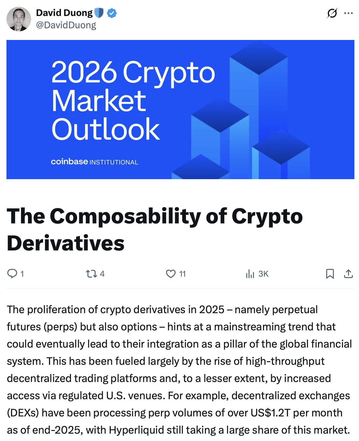 Crypto derivatives activity picked up sharply in 2025 as traders increasingly turned to onchain perpetual futures, according to Coinbase researcher David Duong. By late in the year, decentralized exchanges were processing more than $1 trillion in monthly perpetual futures volume, underscoring the growing role of onchain derivatives markets.