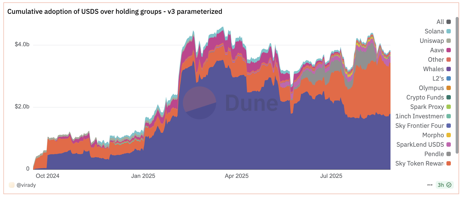 Rajiv, a lead contributor to Sky’s analytics effort, offered some nuance on the community call: “It just feels like the sweet spot for sUSDS is really these large, more institutional-type holders who really value the immediate liquidity.” Crypto funds like Galaxy Digital were cited as recent stakers, even as smaller long-tail users pulled back from Sky token reward participation.