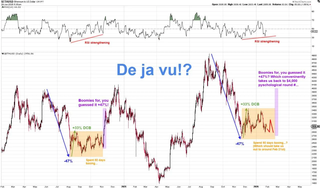 He said the current market shows a similar look. The chart drew another 47% drop into late 2025, followed by a sideways range that the post labeled as a basing period. It also noted a strengthening RSI trend line, suggesting momentum has improved compared with prior lows.
