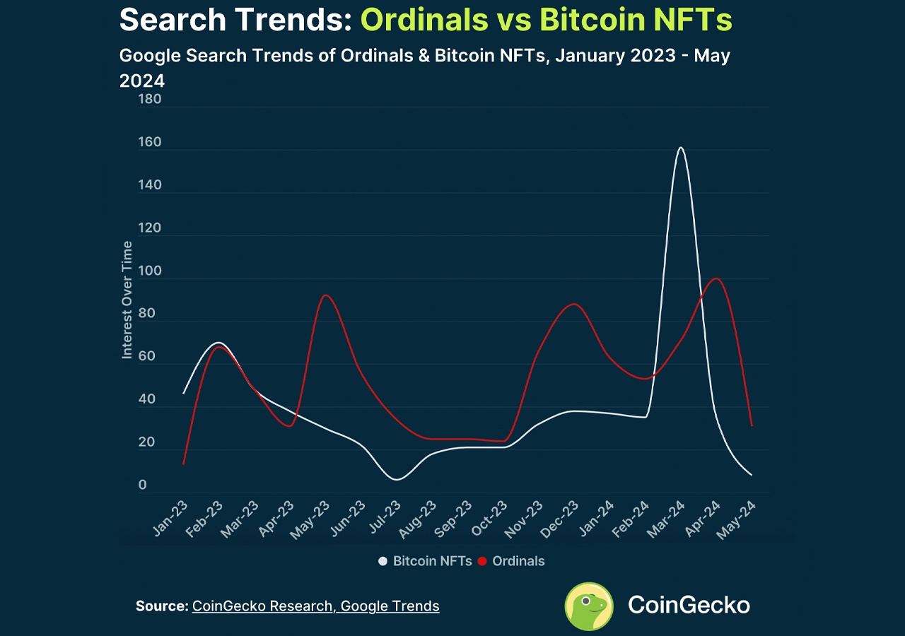 User engagement is also on the rise, with Bitcoin Puppets experiencing a 15.3% month-on-month growth in unique holders, now tallying up to 6.7k from January to May 2024. Similarly, Nodemonkes observed a 10.1% increase in its user base. This uptick in adoption is paralleled by a notable spike in Google search interest for “Ordinals” and “Bitcoin NFTs,” peaking in recent months and illustrating a heightened global curiosity and engagement with these digital assets.