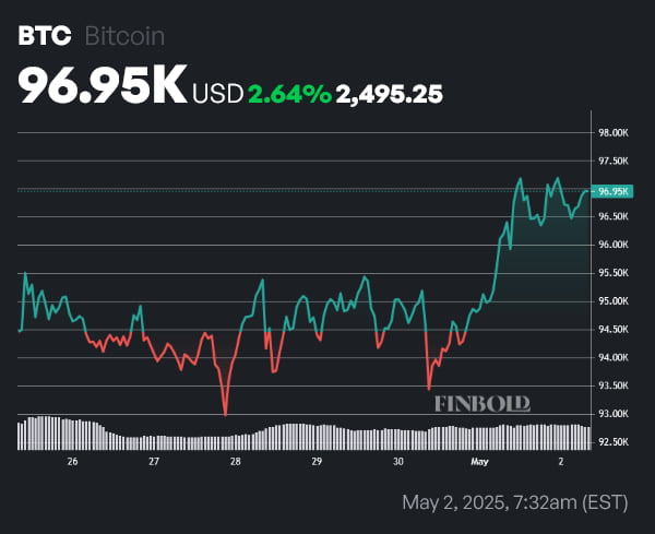 The leading digital asset was trading at $96,950 at press time on May 2, having seen a 2.64% increase in price over the past week.
