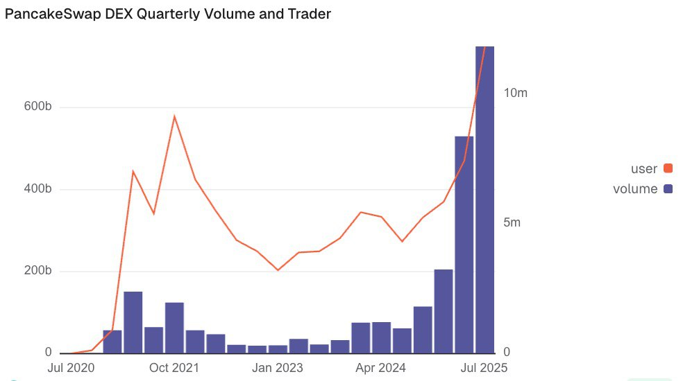 In Q2, the platform recorded $529 billion, following $205.3 billion in Q1, marking the first time since its 2020 launch that PancakeSwap has posted three consecutive quarters of record growth, according to data from Dune.