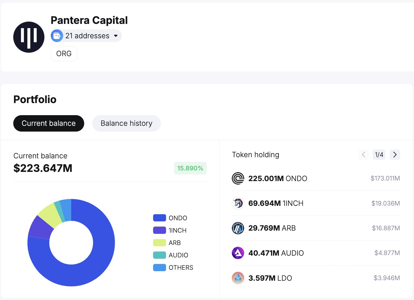 A preview of Pantera Capital’s current cryptocurrency holdings displays a diversified asset distribution totaling $223.647 million. The largest share of the portfolio is held in ONDO tokens, which represent 15.89% of the total balance, equivalent to about $35.513 million.