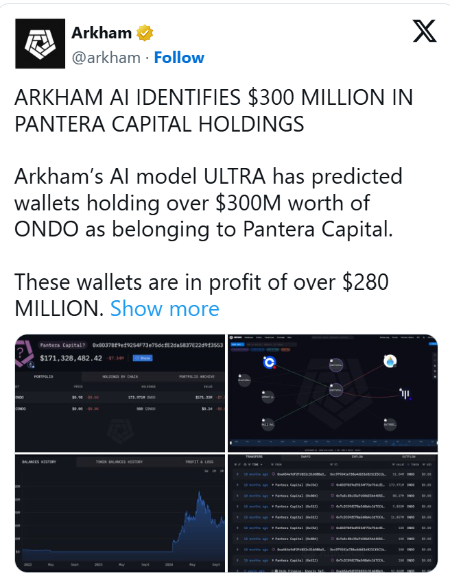 Arkham’s artificial intelligence model, ULTRA, recently unveiled that Pantera Capital controls wallets containing ONDO crypto tokens valued at over $300 Million.