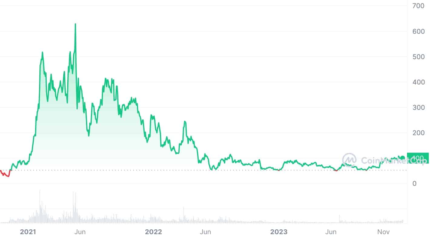 If AAVE reaches its previous all-time high, the investor’s current holdings would be worth around $100 million. At the time of writing, AAVE is trading at around $100.4, an 80% increase since the start of the year.