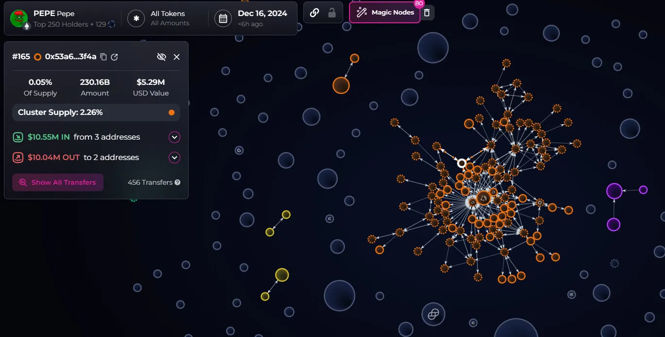 Pepe (PEPE) is widely distributed, but there are still clusters of connected wallets, linked by smart contracts. | Source: Bubblemaps