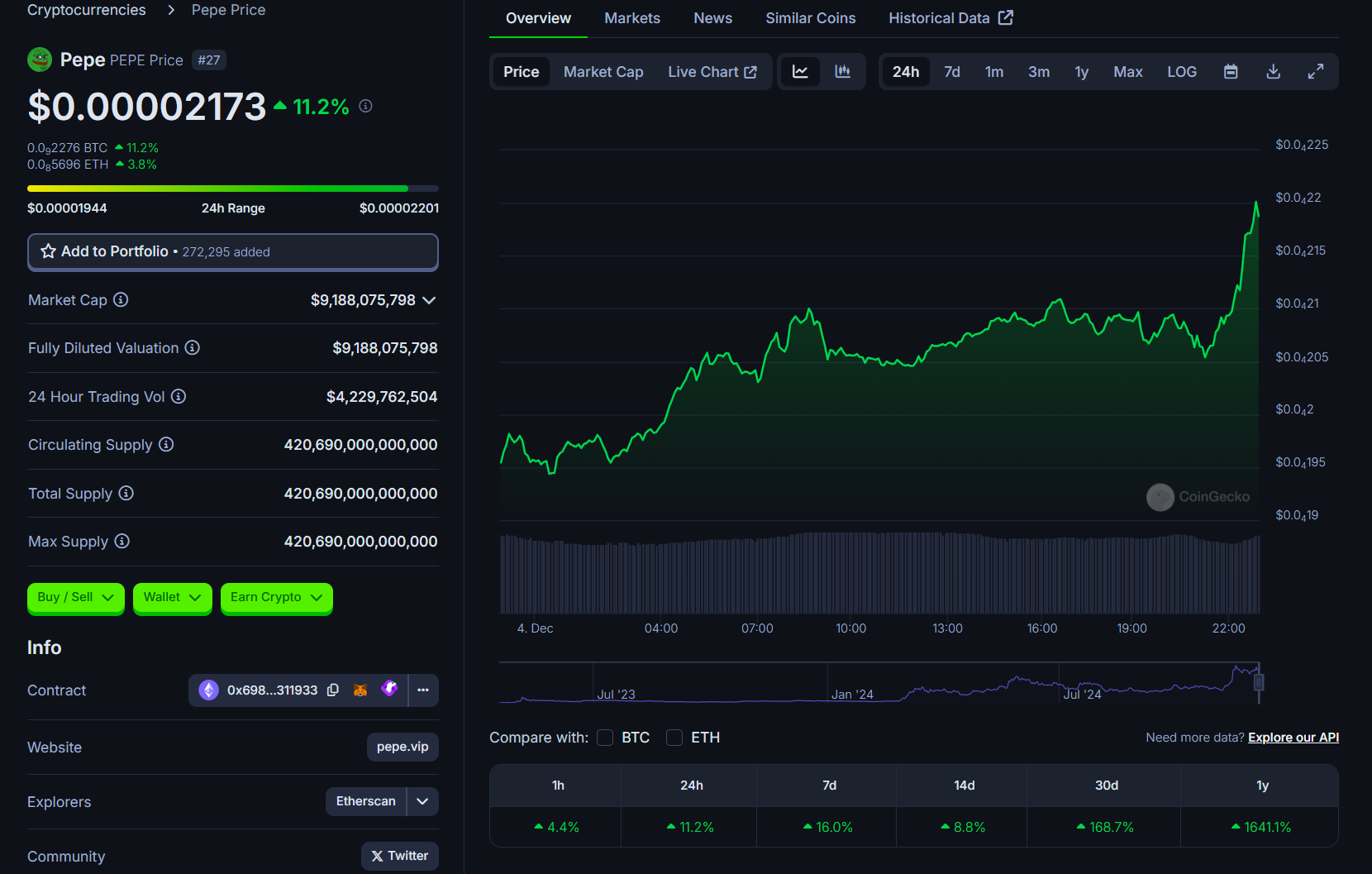 PEPE traded at approximately $0.000022 at press time, showing a 11% increase over 24 hours, with a market cap of $8.8 billion.