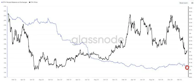 Glassnode analytics platform indicated that the percentage of Ethereum held on centralized exchanges is approaching all-time lows. The firm showed that only 14% of the total ETH supply was left.