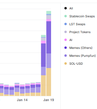The traffic on Solana was highly targeted, concentrated between fiat and SOL swaps and memecoin trades. The most active category of trades was for memecoins outside the Pump.fun ecosystem, primarily due to the rush for the newly launched TRUMP token, as well as rollovers to MELANIA, BARRON, and a series of new assets.