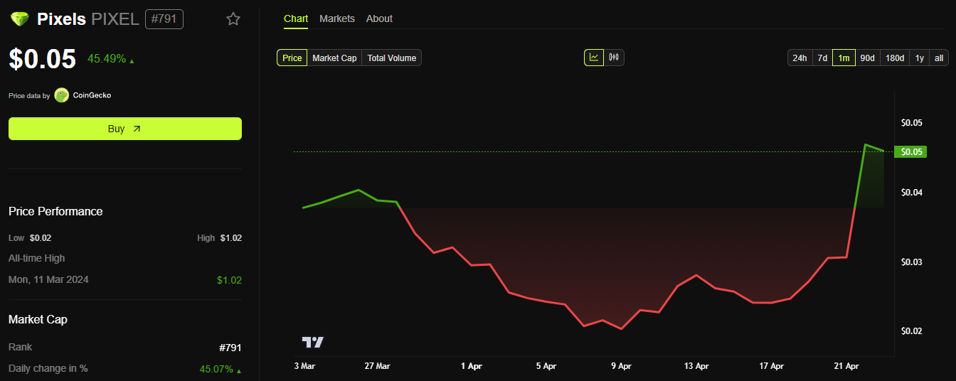 Pixels (PIXEL), a game built on the Ronin Network with unique pixel graphics, is regaining attention this April. The PIXEL token has surged 150% in price.