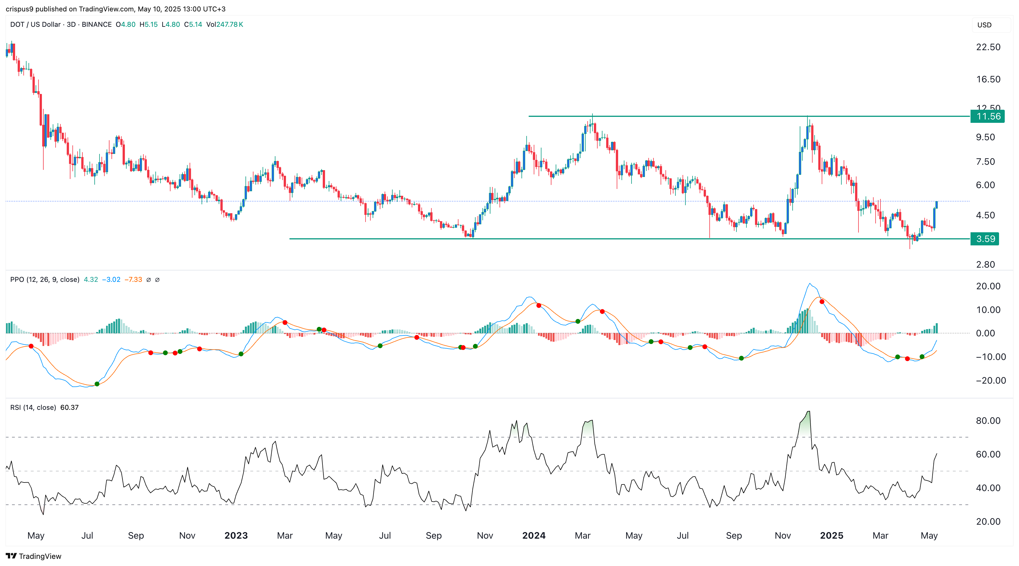 The three-day chart shows that the DOT price found strong support at $3.60, a level it has failed to move below since November 2023. It has formed a triple-bottom pattern, a popular bullish reversal pattern whose neckline is at $11.56.