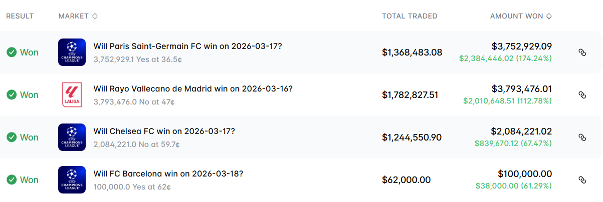 The four closed trades involved the games between various Spanish, French, and British clubs, and the largest win – the wager that Paris Saint-Germain would win on Wednesday, March 17 – saw a $1.36 bet turn into $3.75 million for a profit of $2.4 million.