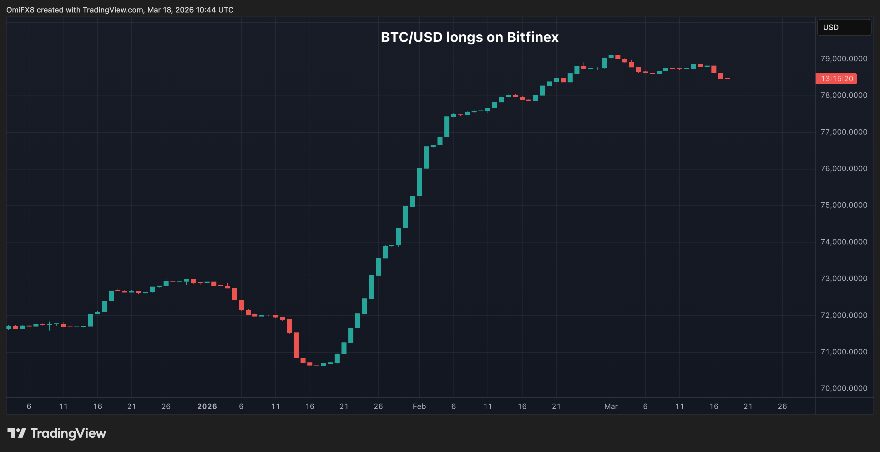 - The chart shows the number of $BTC/USD longs, or bullish bets, on Bitfinex.