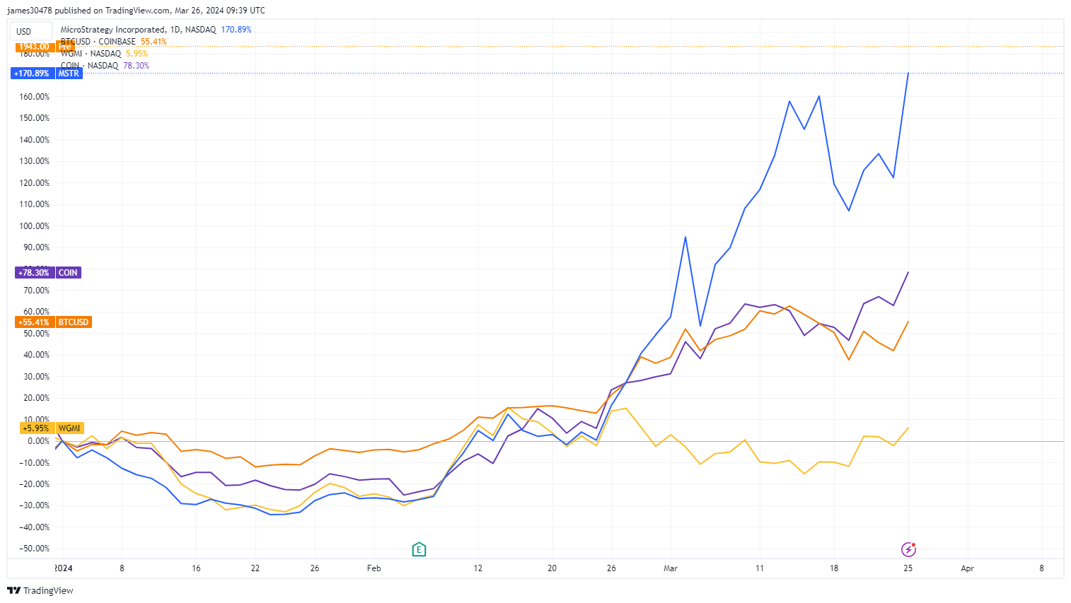 MicroStrategy has exhibited a remarkable performance in the year-to-date analysis, with its value surging by 171%, outpacing Bitcoin’s 55% increase in the same period. Coinbase also demonstrated robust growth, with a commendable 78% rise. In contrast, the WGMI ETF, which serves as a proxy for the Bitcoin mining industry, has shown a modest gain of 6%.
