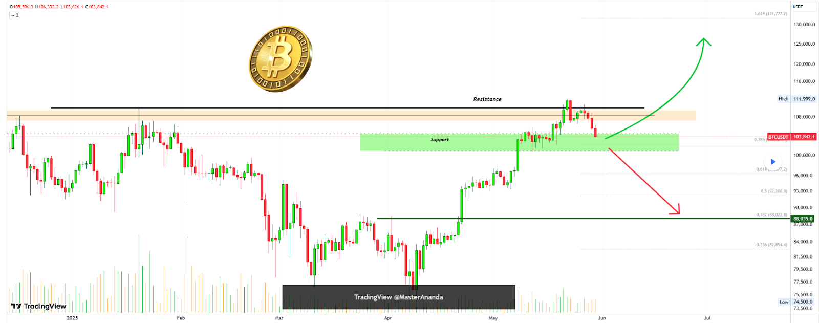 Specifically, Master Ananda’s analysis shows that the $100,000 to $103,000 range now serves as Bitcoin’s key support. If this level fails, traders should brace for a red week followed by sideways consolidation before any meaningful recovery, according to a May 31 post on TradingView.