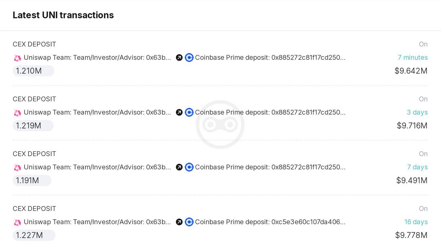 Particularly, four whale addresses stood out, withdrawing 1.04 million UNI from Coinbase Prime right after the most recent deposit. With that, these addresses alone absorbed 85% of the 1.21 million tokens from the Uniswap team-linked wallet.