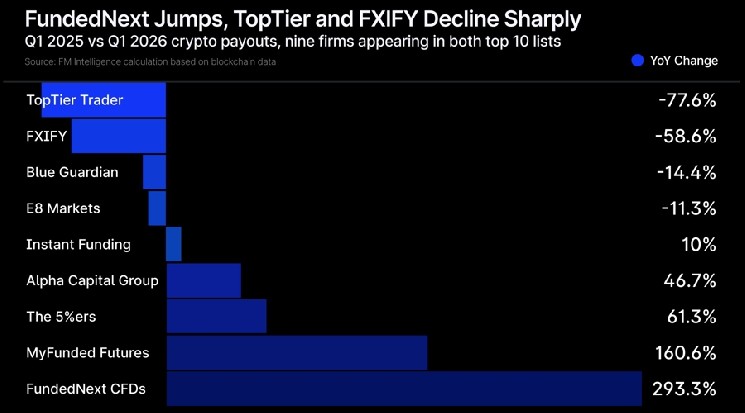 Within the cohort, the distribution of growth was uneven. FundedNext CFDs climbed 293% year-over-year to $42.7 million, while MyFunded Futures rose 161% to $38.5 million. Together the two firms represented 70.5% of Q1 2026 tracked payouts across the top 10. Six other operators moved the other way, with TopTier Trader down 78%, FXIFY down 59%, and Blue Guardian and E8 Markets both posting double-digit declines.